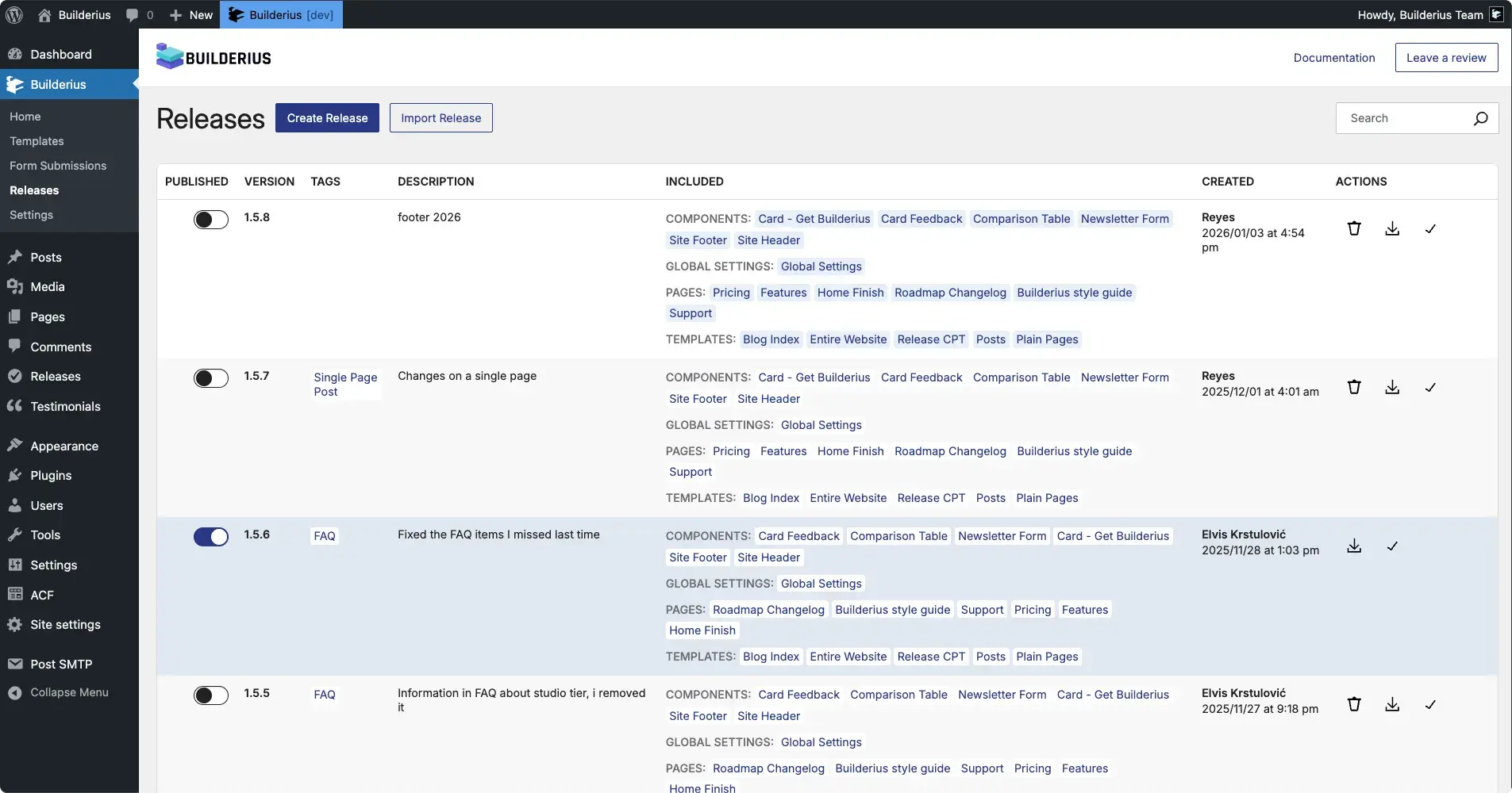 The concept: Reyes worked on a staging branch of the live site. Users visiting builderius.io never saw the work in progress, the broken layouts, the beta-induced chaos. When a version was ready, it could be published as a release, instantly, no downtime, no migration.